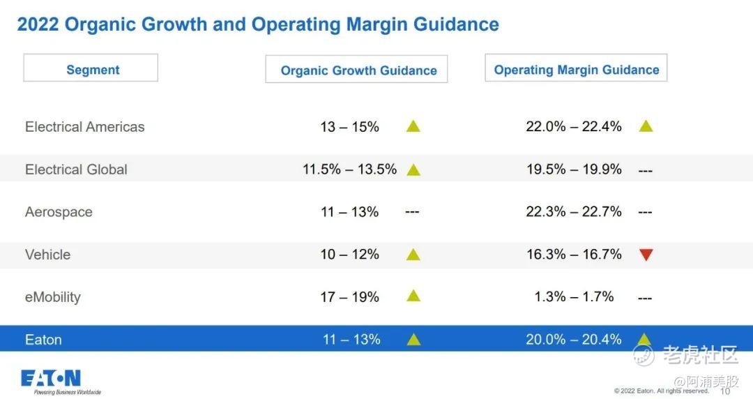 伊顿在2022年第二季度实现了创纪录的营业利润率,为13.6%,比2021年同季度增长1.3%。鉴于美国电气业务的强劲表现抵消了车辆业务利润率的下降,公司上调了2022年的营业利润率预期;还将今年的有机销售增长预期上调至12%。这一有机增长足以弥补2021年液压领域的出售和美元走强对销售造成的汇率冲击。