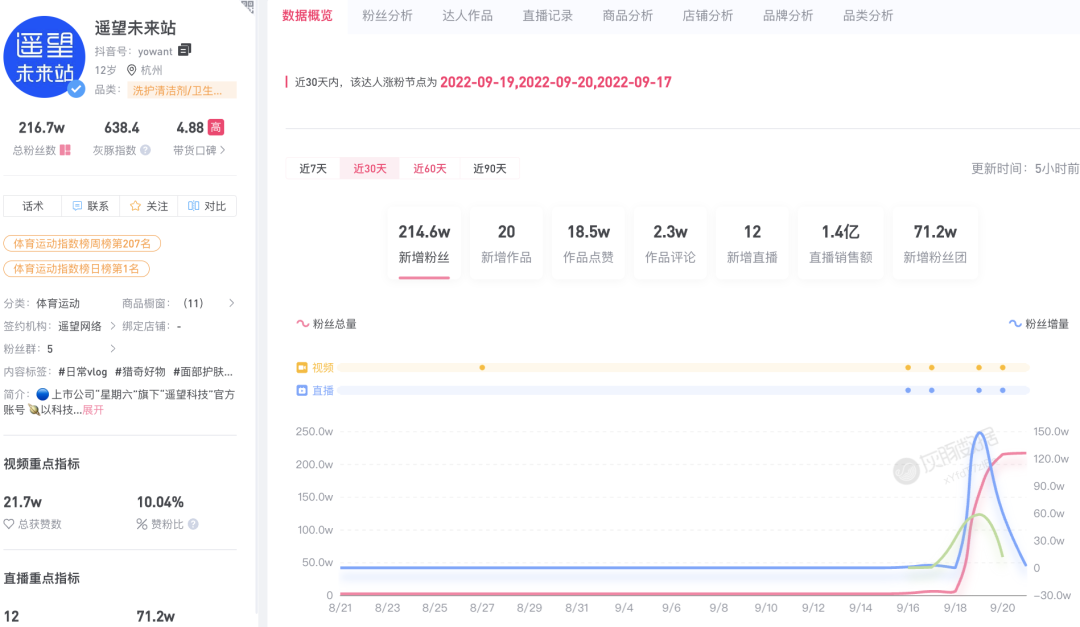 MCN机构也开始自己下场做起直播。继交个朋友、东方甄选之后,明星主播背后的MCN机构遥望网络,也于近期在抖音开启了直播。据灰豚数据显示,遥望网络在抖音的账号“遥望未来站”,近7天12场直播销售额达到1.4亿元,甚至一度力压东方甄选,冲到抖音带货榜前五。