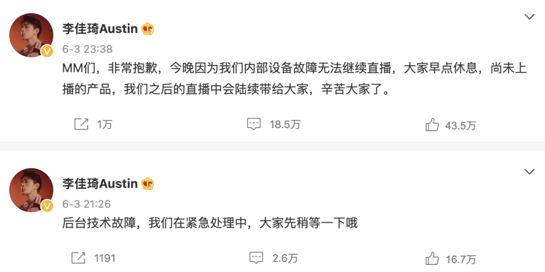 6月3日,李佳琦直播到一半的时候突然中断,之后,他在个人微博发文称,“后台技术故障,我们在紧急处理中,大家先稍等一下”。紧接着两个小时后,李佳琦再度发文,“MM们,非常抱歉,今晚因为我们内部设备故障无法继续直播,大家早点休息,尚未上播的产品,我们之后的直播中会陆续带给大家。”