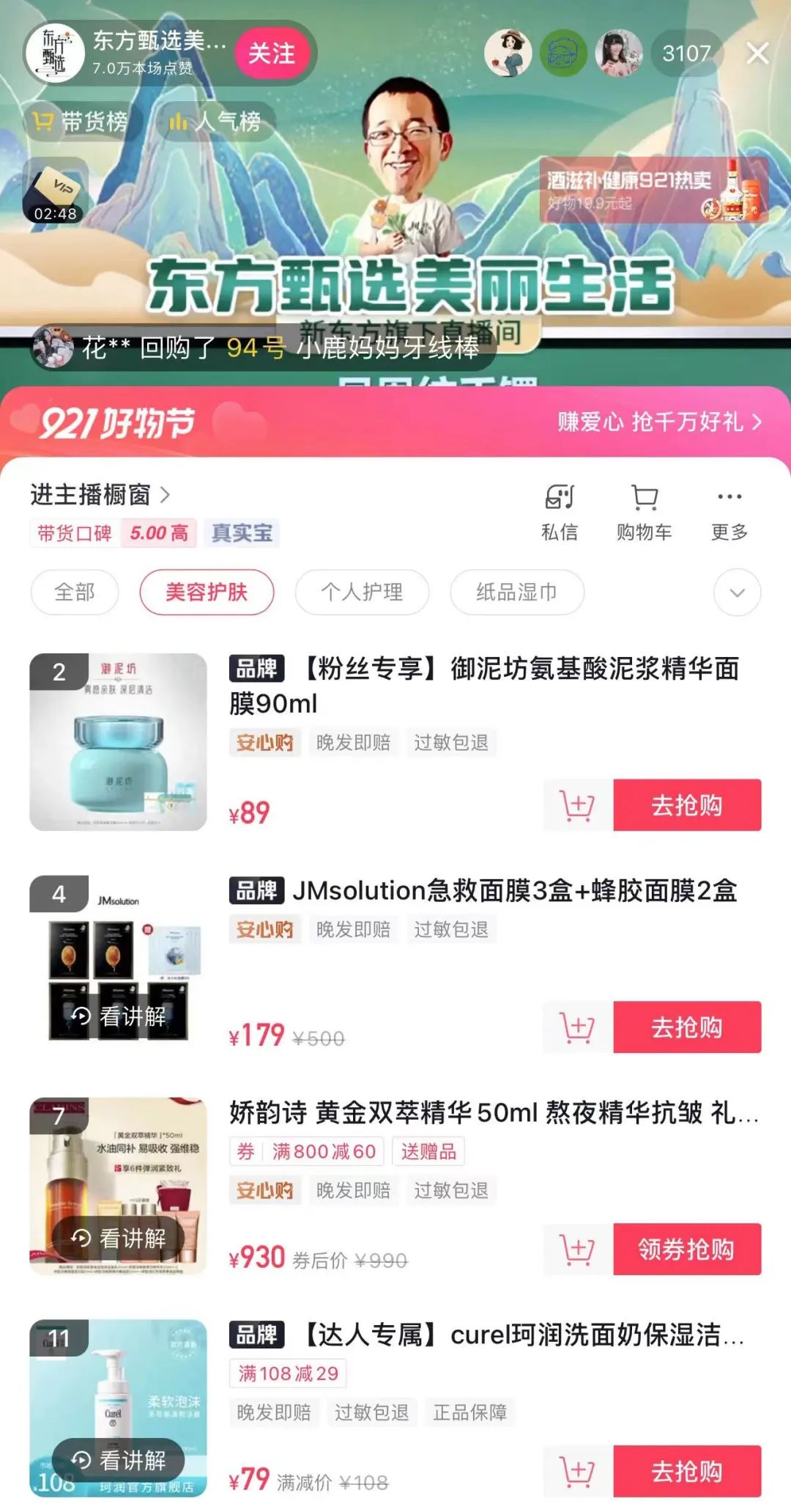 美妆品牌也在青睐新晋直播间。东方甄选美丽生活账号里的商品以美容护肤为主,直播间不仅有薇诺娜、玉泽、御泥坊、半亩花田等国货美妆护肤产品,而且不乏阿玛尼、科颜氏、娇兰、赫莲娜等大牌美妆护肤产品。在9月18日的直播中,一款售价1030元的阿玛尼香水销售了366单,销售额达到38万元。