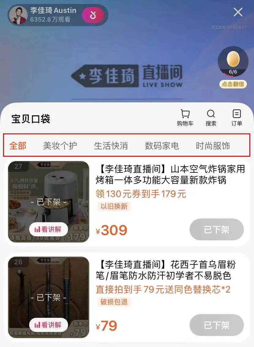 这次出现在李佳琦直播间的商品包含了美妆个护、生活快消,和少量的数码家电和时尚服饰。这种在直播间商品展示页提供分类类目的方式,在东方甄选和交个朋友直播间也出现过,而很大程度上,李佳琦直播间也有可能效仿它们,建立“直播间矩阵”的可能性,零售电商行业专家、百联咨询创始人庄帅表示,“(李佳琦)有可能孵化矩阵账号规避封号风险”。
