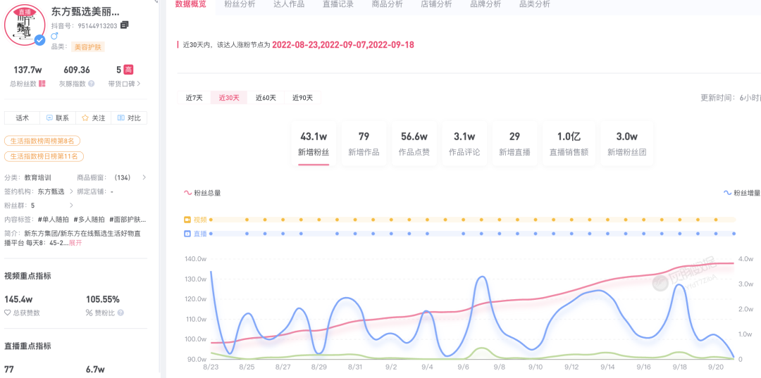 除了东方甄选直播间,在抖音上,东方甄选还孵化了多个账号矩阵,例如东方甄选之图书、东方甄选自营产品和东方甄选美丽生活。截至目前,东方甄选美丽生活账号已有粉丝137万,自8月22日开始的最近30天,28场直播,销售额达到了1亿元,场均销售额为357万元。在9月18日的直播中,东方甄选美丽生活的销售额达到947万元。