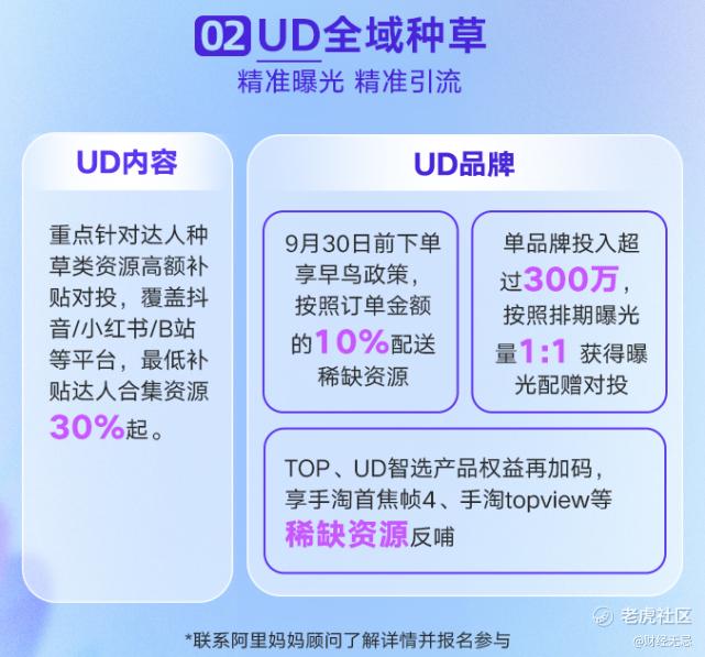 蓄水阶段的全域种草,也是核心。品牌可通过UD大外投实现全域曝光,锁定热门媒介实现人群破圈,精准触达高潜客群。其中UD内容重点针对达人种草类资源高额补贴对投,规模化人群蓄水,UD品牌深度整合顶级媒体资源,精准曝光、精准引流,权益同时再加码,9月30日前下单可享早鸟政策;UD效果则可拓展全域优质渠道,精准人群+全域流量,强强联动完成新老客触达。