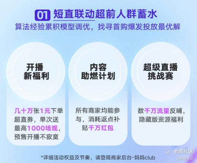 对此,在前期蓄水中,超级直播对新投放品牌寄予了流量扶持,提供几十万张1元下单超直券,单次送最高1000场观,预售开播不寂寞;针对所有商家的内容助燃计划,消耗返点补贴千万红包;超级直播挑战赛则提供数千万流量反哺。同时通过超级短视频触达差异化的兴趣人群,再用超级直播对回流的人群进行再营销,大大降低了品牌的投放成本,帮助新品实现流量的快速增长。