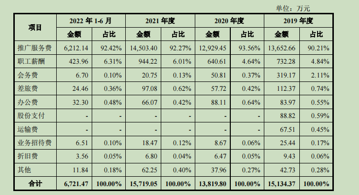 据招股书披露,孚诺医药的销售费用主要由推广服务费、职工薪酬、会务费、差旅费、办公费组成。报告期内,该公司推广服务费分别为13652.66万元、12929.45万元、14503.4万元和6212.14万元,占销售费用的比例均在90%以上,占营业收入比例分别为54.07%、50.23%、49.59%和49.24%。