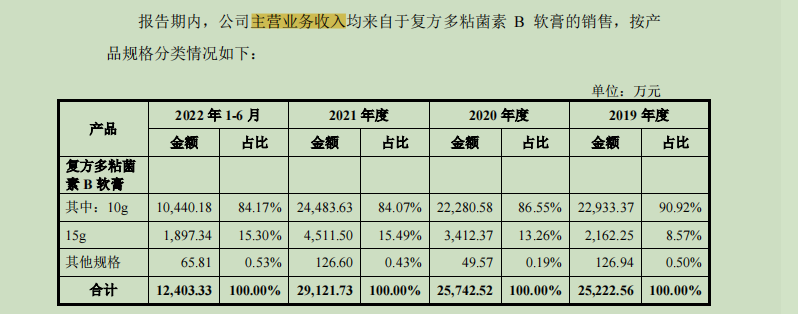2019年-2021年以及2022年1-6月,孚诺医药10g规格的复方多粘菌素B软膏销售收入分别为22933.37万元、22280.58万元、24483.63万元和10440.18万元,占主营业务收入的比例分别为90.92%、86.55%、84.07%和84.17%;同期15g规格的复方多粘菌素B软膏销售收入分别为2162.25万元、3412.37万元、4511.5万元和1897.34万元,占主营业务收入的比例分别为8.57%、13.26%、15.49%和15.3%。