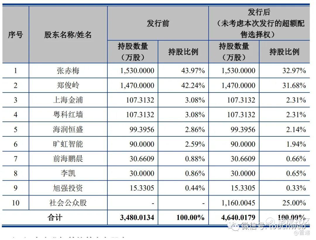 IPO后,张赤梅持股为32.97%,郑俊岭持股为31.68%,上海金浦、粤科红墙分别持股为2.31%,海润恒盛持股为2.14%,旷虹智能持股为1.94%,前海鹏晨持股为0.66%,李凯持股为0.65%,旭强投资持股为0.33%。