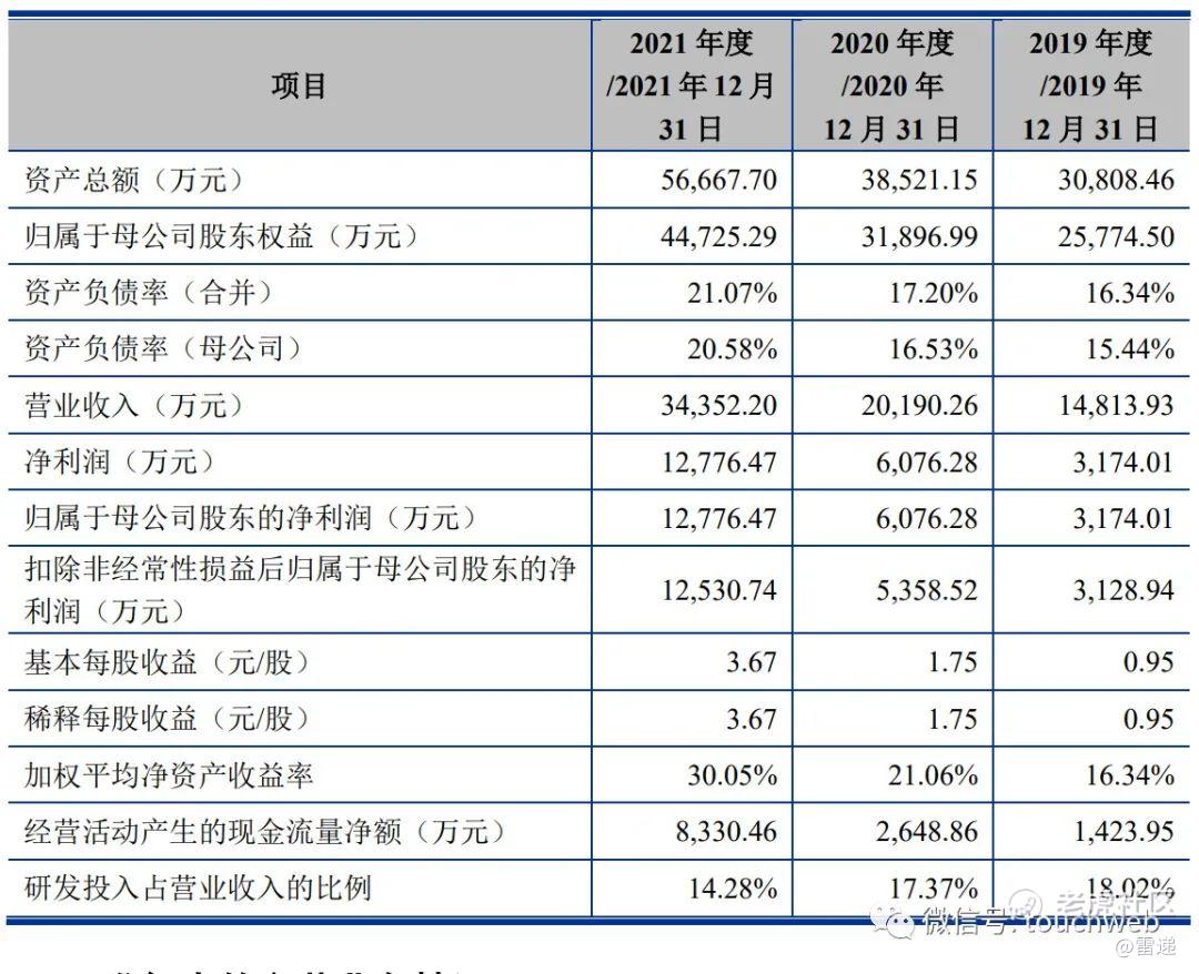 招股书显示,联动科技2019年、2020年、2021年营收分别为1.48亿元、2.02亿元、3.44亿元;净利分别为3174万元、6076万元、1.28亿元;扣非后净利分别为3128.94万元、5358.5万元、1.25亿元。