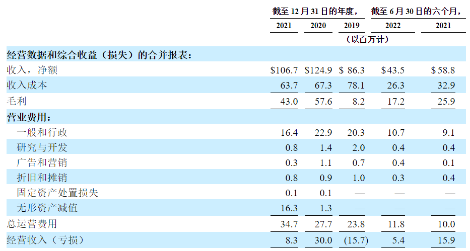 公司2019-2021年三年,分别录得营收8630万美元、1.25亿美元、1.07亿美元,2022年上半年营收4350万美元;同期毛利率分别为9.5%、46.1%、40.3%,以及39.5%,同期净利润分别为-1520万美元、2980万美元、790万美元和480万美元;同期调整后EBITDA为-1510万美元、3920万美元、2550万美元以及610万美元。