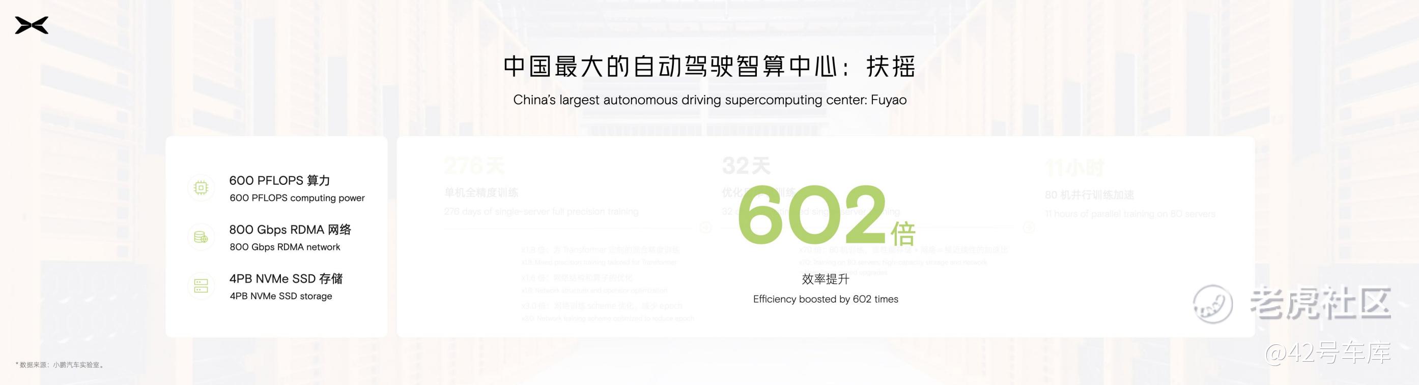 今年 8 月小鹏汽车宣布在乌兰察布建成中国最大的自动驾驶智算中心「扶摇」,用于自动驾驶模型训练,算力达到 600 PFLOPS,效率相比原来提升了 602 倍。