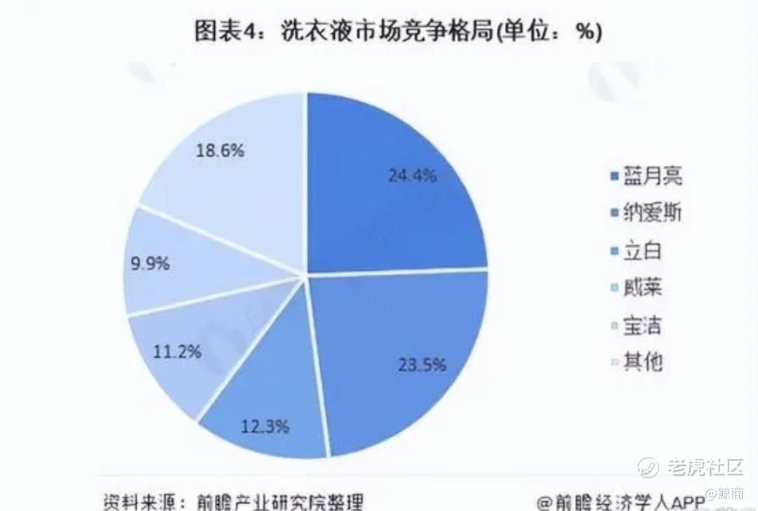 据前瞻研究院2020年统计数据显示,蓝月亮市场占有率为24.4%,市场占有率最高;纳爱斯紧随其后,市场占有率为23.5%。