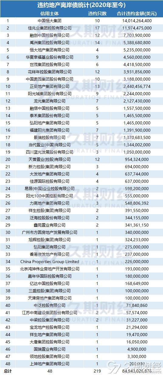 据久期财经数据显示,2020年迄今已有48家主体发行的219只地产离岸债触发违约,合计违约金额近850亿美元。其中,中国恒大累计违约金额逾140亿美元;佳兆业集团的境外债也有近120亿美元触发违约。