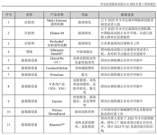 通过管理、整合全球资源,华东医药全球医美业务已拥有无创+微创医美领域产品36款,其中海内外已上市产品达22款,在研全球创新产品14款,产品组合覆盖面部填充、面部清洁、埋线等非手术类主流医美领域,产品数量和覆盖领域均居行业前列。