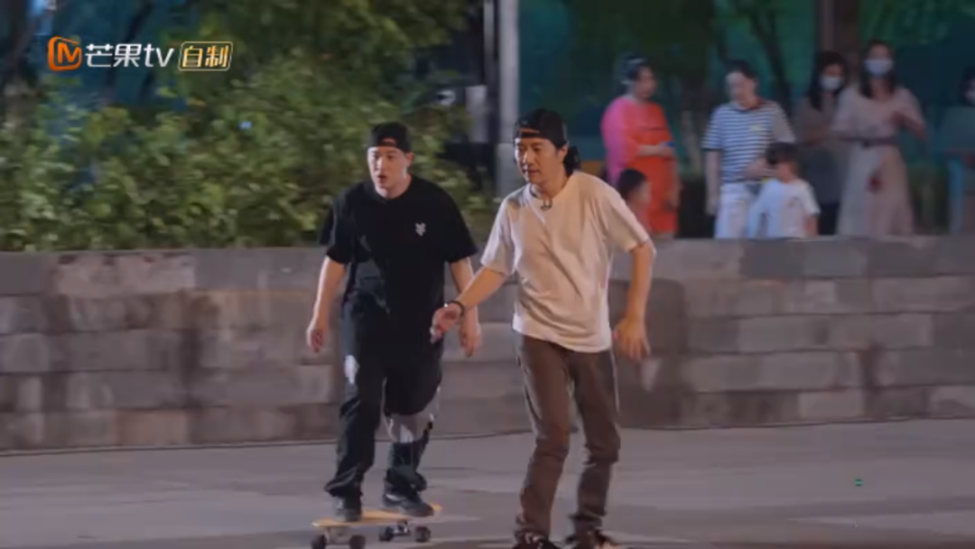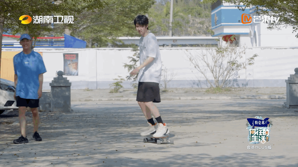 刘昊然在《向往的生活》里用陆地冲浪板刷街。