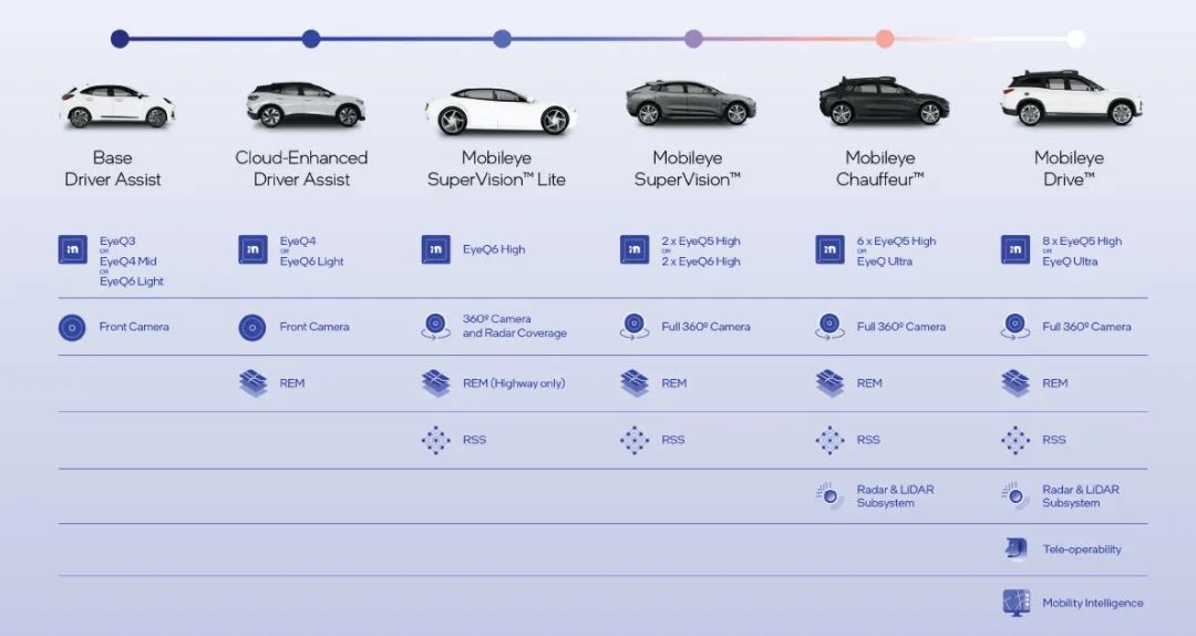 具体来看,第一类是最基础的驾驶员辅助能力(Base Driver-Assist),也就是常规的L1~L2入门级功能,这也是Mobileye赖以起家的常规ADAS产品线。通过EyeQ3、EyeQ4或者EyeQ 6L,Mobileye提供单目视觉感知解决方案。