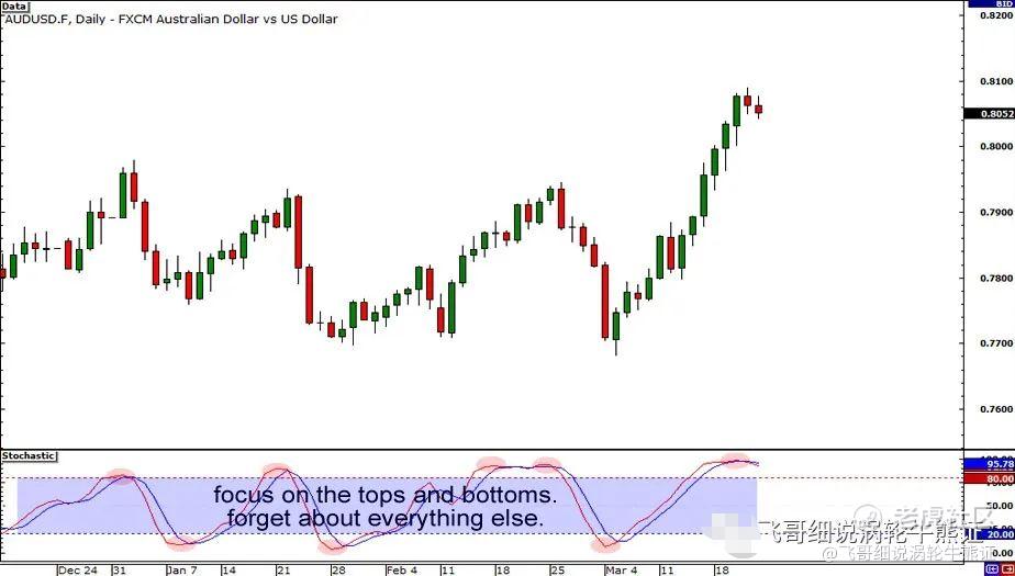 常用的技术指标是震荡指标MACD、RSI和KD指标。可以单独使用,也可以两者结合。如下图用到的是KD指标(Stochastic Oscillator)。