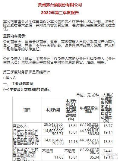10月16日晚,贵州茅台发布2022年三季报,公司前三季度实现营业收入871.6亿元,归母净利润为444亿元,同比增长19.1%。