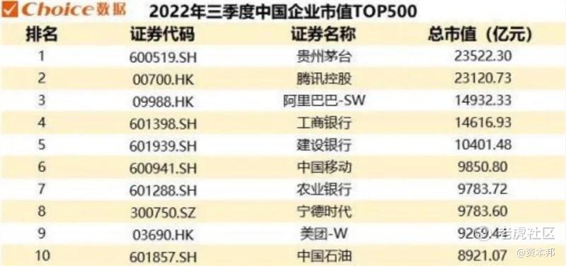 近日,东方财富Choice数据发布《2022年三季度中国企业市值500强榜单》,显示2022年三季度中国企业500强总市值约为63.27万亿元,贵州茅台超过腾讯控股成为三季度中国大陆市值最高的企业,总市值2.35万亿元。