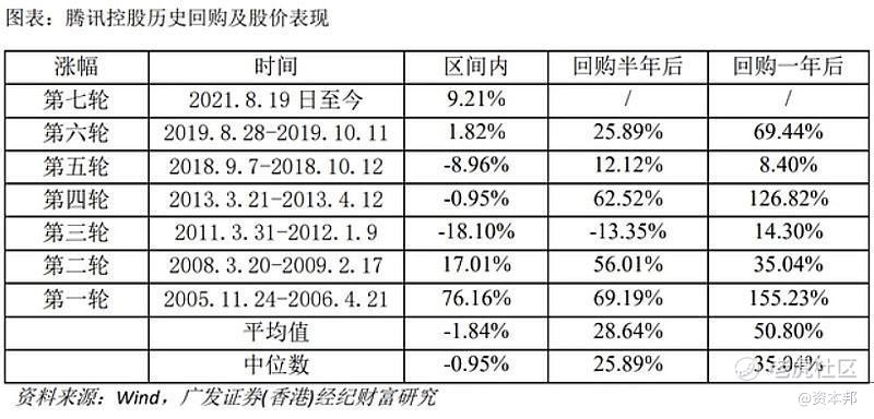 广发证券通过复盘腾讯历史上七次股份回购周期的股价表现发现,通常腾讯股价在回购时期表现平淡,但在回购半年和一年后经常会有出色的表现。