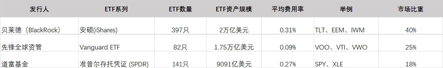 过去十年,ETF成为了全球最受欢迎的投资品种,它连续吸收资金,作为被动投资理念的产物,对主动管理型基金不断制造压力。在美国的ETF领域,$贝莱德(BLK)$(BlackRock)、先锋(Vanguard)、道富资管(State Street Global Advisors)三大巨头覆盖了了美国 ETF产业超过 80%的份额。接下来,就让我们简单观察下,三大巨头的当前格局以及今年以来ETF表现情况。