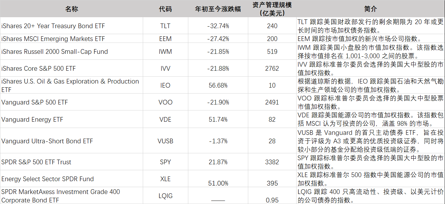 年初至今,贝莱德表现最好的贝莱德 ETF是 IEO,涨幅为 56.68%。先锋全球资管表现最好的 Vanguard ETF是 VDE,涨幅为51.74%。道富基金表现最好的ETF是 XLE,涨幅为 51%。三只ETF均为能源ETF。