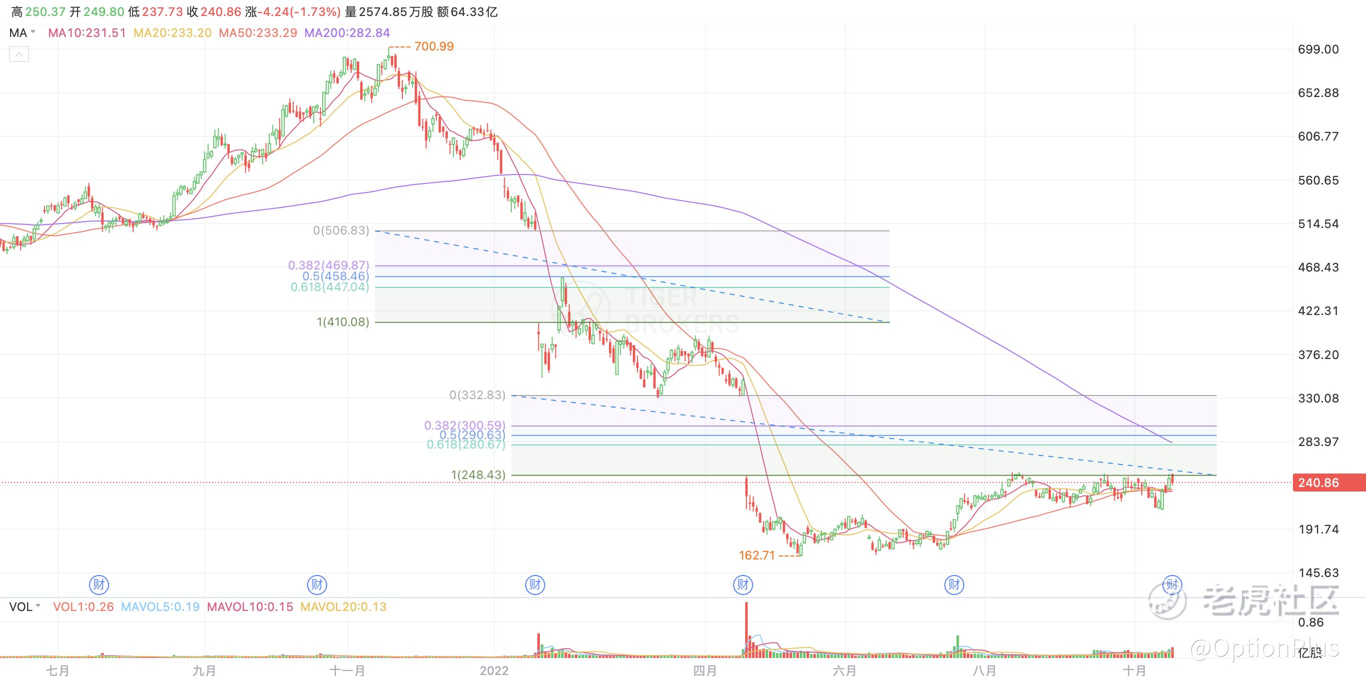 财报落地后,来review一下NFLX股价走势。NFLX最高点$700.99,最低点$162.71,最大跌幅76.8%。其中两次非常大的缺口均由于财报,分别是3月发布的去年Q4财报,单日跌幅超过20%,缺口在507-409之间,宽度达98个点。第二个是4月的Q1财报,单日跌幅高达35%,缺口在333-249,宽度84个点。