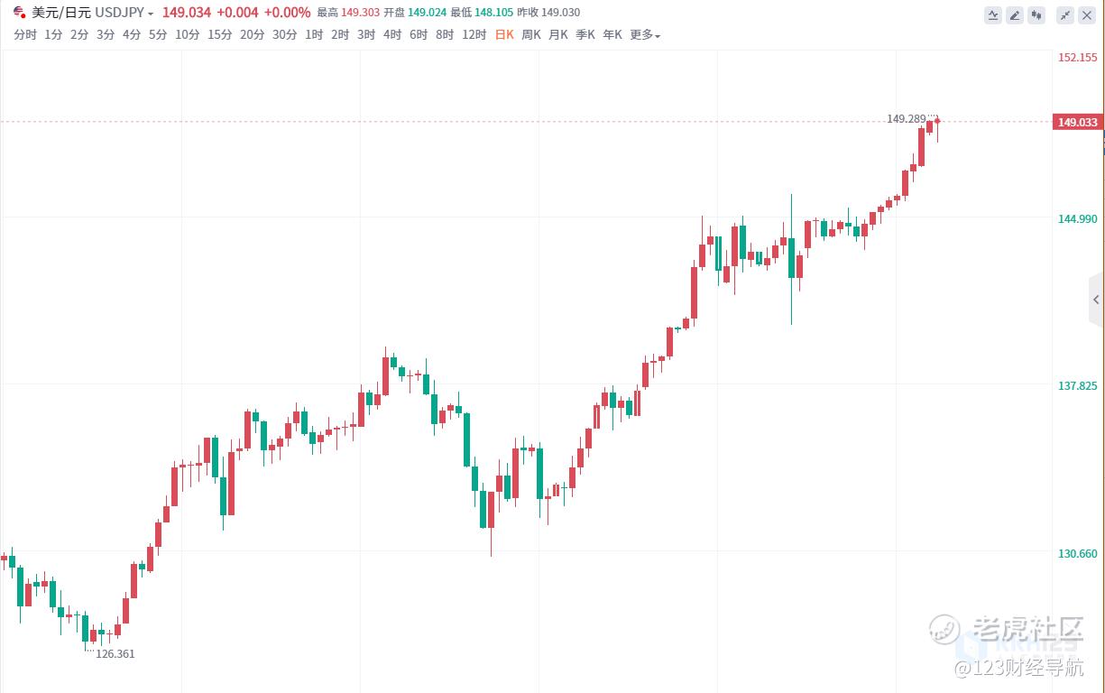 全球央行加息潮,但仍跟不上美国老大哥的脚步,欧元兑美元跌破1:1平价,美元兑日元逼近150,屡次突破历史新高,日本财务省不定时干预市场,美日三天两头拉根大阴线,人民币也接连贬值破7,美元债先后违约...;
