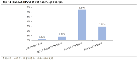 目前,HPV疫苗渗透率依然偏低。2021年,国内二价、四价、九价疫苗市场份额占比分别为9.38%、40.63%和50%。默沙东9价HPV疫苗的渗透率最高,为6.54%。