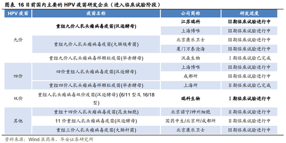 如今战火正烧向九价疫苗市场。据统计,至少有16个国产HPV疫苗在研。其中,万泰生物、瑞科生物、博唯生物、康乐卫士以及沃森生物,已有这五家企业九价疫苗进入三期临床。