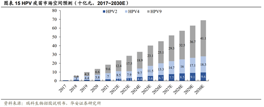 华安证券分析师谭国超5月30日发布的研报指出,目前中国暂无商业化国产九价HPV疫苗产品。2017年中国首次批准HPV疫苗上市,2020年HPV疫苗市场规模迅速增长到135亿元,预测2030年HPV疫苗市场规模将增长至690亿元,2020-2030年的复合年增长率为17.7%。
