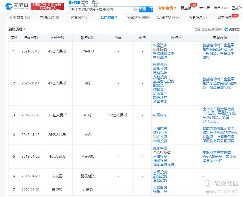据天眼查显示,自2016年开始,零跑共完成6轮融资,融资金额高达115.6亿元,其中包括红杉资本、中金、国信证券、中信建投等实力投资商。