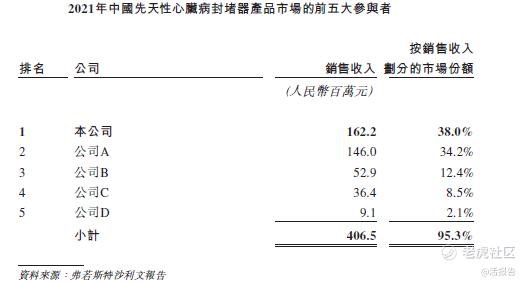 在中国,国内先天性心脏病封堵器制造商于市场占据主导地位,2021年的市场份额约为91.5%,余下约8.5%由国际先天性心脏病封堵器制造商占据。下图分别载列按2021年于中国销售确认的收入划分,中国封堵器产品市场的前五大参与者。公司是中国最大的先天性心脏病封堵器产品及相关手术配套产品制造商。