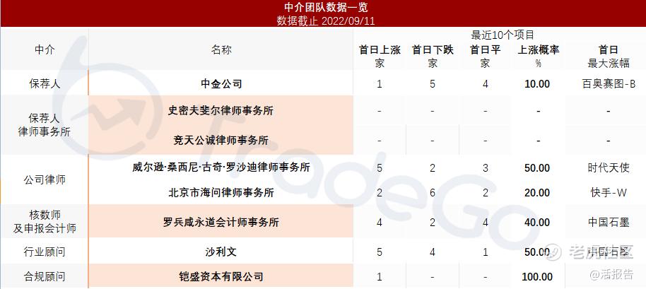 据捷利交易宝数据统计,乐普心泰中介团队共计8家,其中保荐人共计1家,近10家保荐项目数据表现一般;公司律师共计2家,综合项目数据一般。整体而言中介团队历史数据表现一般。