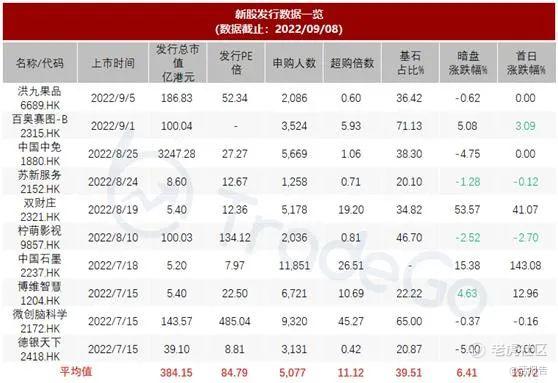 暗盘及首日收益率上,7月中旬近9家集中上市,其中仅博维智慧暗盘及首日表现尚可,中国石墨首日罕见暴涨143.08%;而随之上市的柠萌影视表现一般,紧随其后又杀出一匹黑马,双财庄暗盘及首日齐飞,似乎小盘新股更受市场青睐;近8月底,苏新服务及中国中免先后上市,整体表现回落;百奥赛图-B作为生物-B公司,少见的暗盘首日上涨;9月初,洪九果品暗盘微跌,首日平收。截至目前,暗盘涨跌整体均值约为5.67%,而首日约为18.93%。