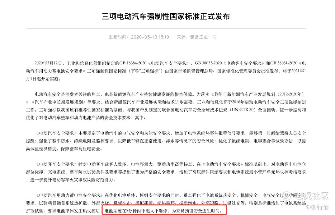 在2021年1月1日起开始实施的《电动汽车安全要求》、《电动客车安全要求》和《电动汽车用动力蓄电池安全要求》三项电动汽车强制性国家标准中,特别增加了电池系统热扩散试验,要求电池单体发生热失控后,电池系统在5分钟内不起火不爆炸,为乘员预留安全逃生时间。
