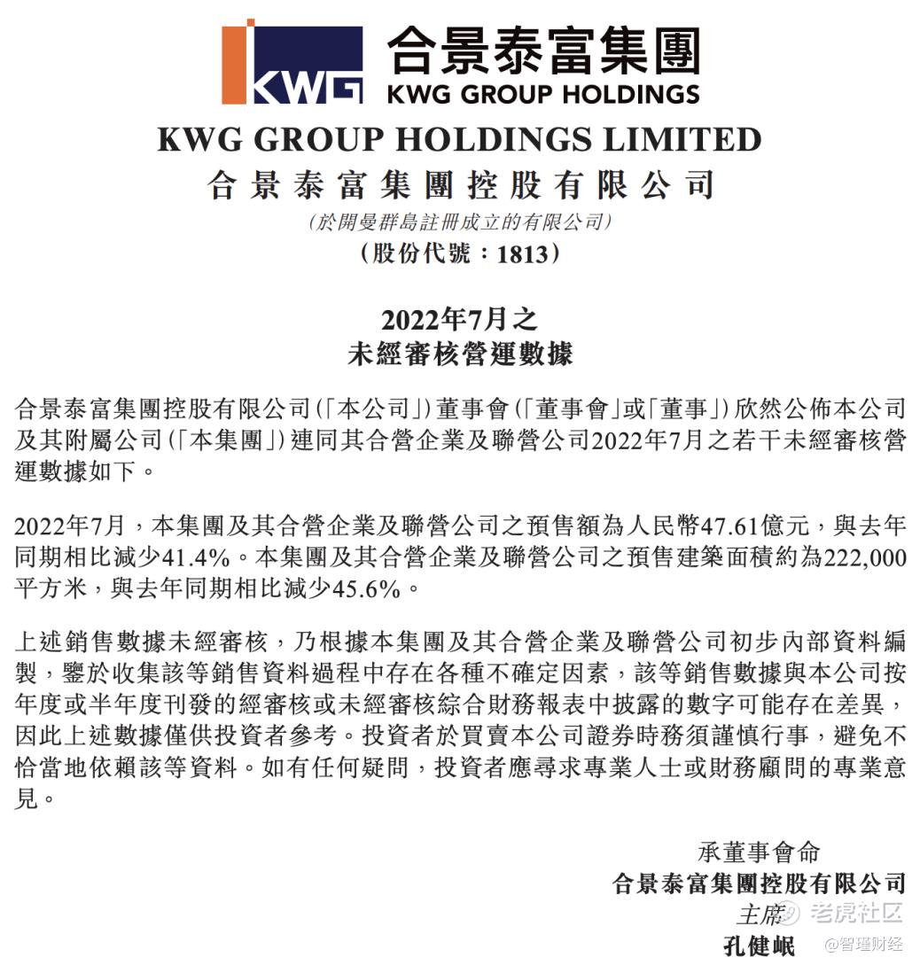 销售方面,截至今年7月,合景泰富实现销售额309.89亿元,同比下降51.79%,其中7月单月仅实现销售额47.61亿元,与去年同期相比减少41.4%。
