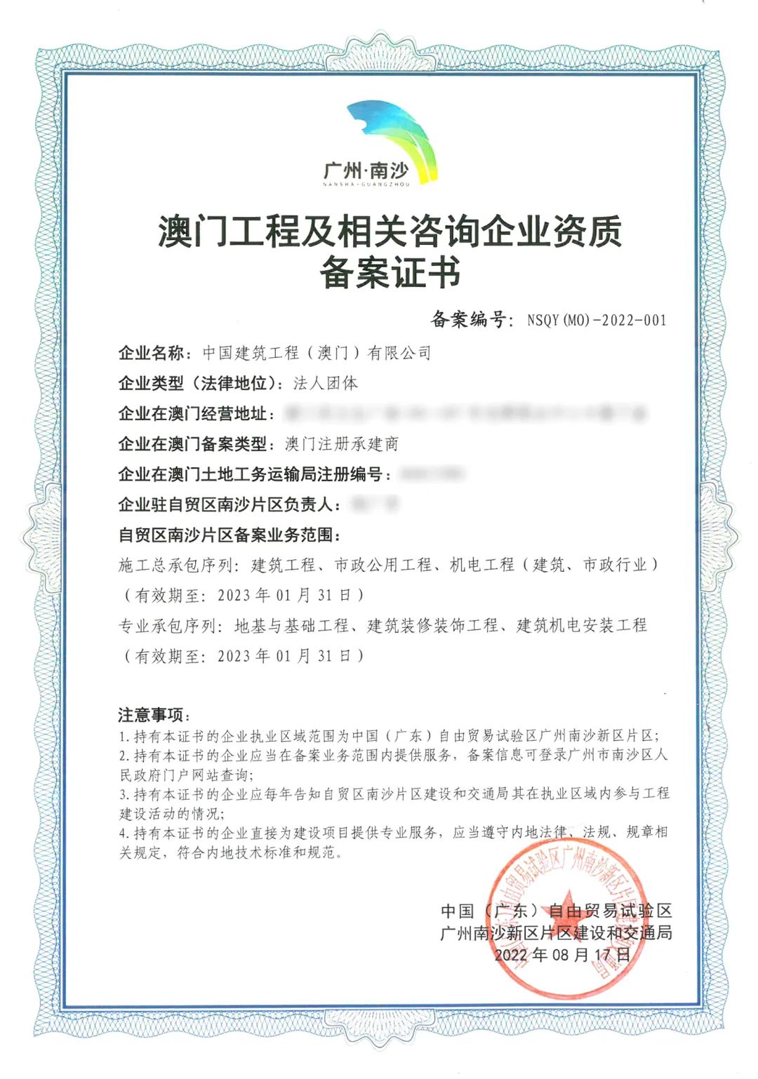中建澳门积极响应国家政策,筹备优势资源,发挥示范作用,助力粤港澳融合,率先取得广州南沙首张澳门工程及相关咨询企业资质备案证书(备案编号NSQY(MO)-2022-001)。
