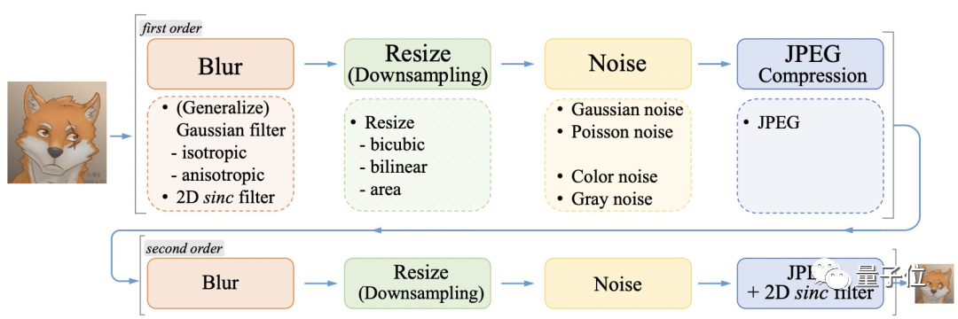原理方面,研究人员引出了高阶退化过程来模拟出更真实全面的退化,它包含多个重复的经典退化过程,每个又具有不同的退化超参: