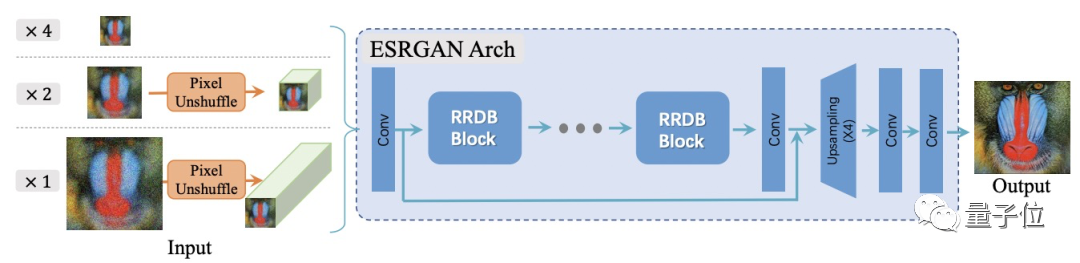 到训练环节,Real-ESRGAN的生成器用的是RRDBNet,还扩展了原始的×4 ESRGAN架构,以执行resize比例因子为×2和×1的超分辨率放大。
