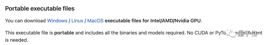 在GitHub上下载该模型的可执行文件,Windows/Linux/MacOS都可以,且不需要CUDA或PyTorch的支持。