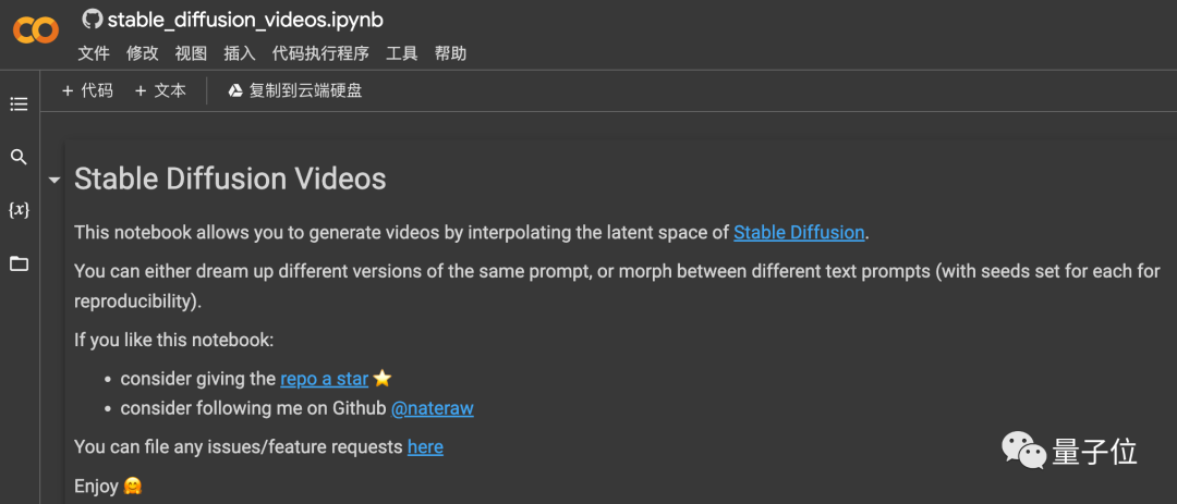 Colab试玩:https://colab.research.google.com/github/nateraw/stable-diffusion-videos/blob/main/stable_diffusion_videos.ipynb