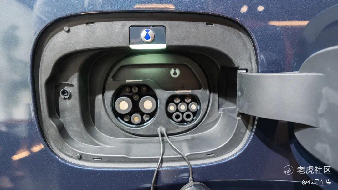 D9 的充电口在车身右后方,快充和慢充在一个位置并都有橡胶保护盖。由于展示是 DM-i 版本,左侧是油箱盖板,如果是 EV 版本,应该能在这个位置看到另一个快充接口用于实现 166kW 双枪快充功能。