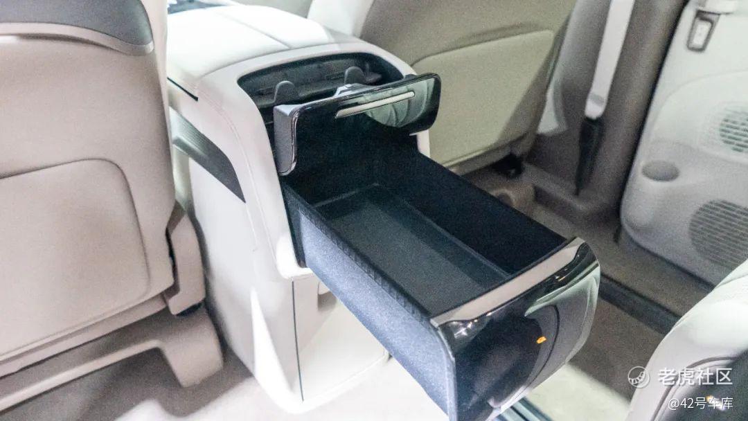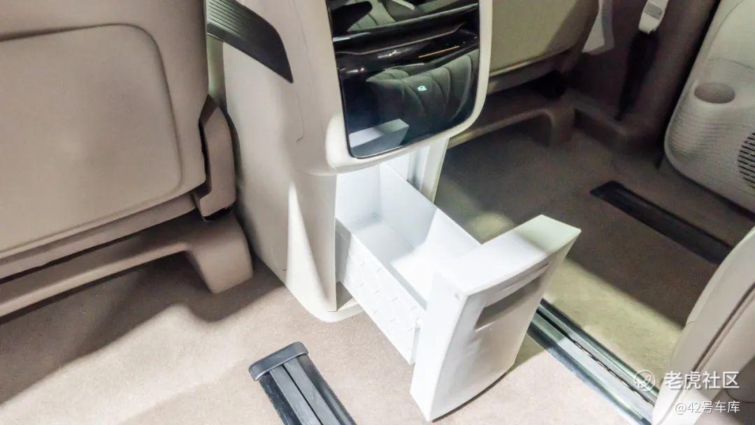 第二排中央区域有三个可伸缩的模块,从上至下分别是杯架、电动托盘以及 5—55 度的双温冰箱,遗憾的是冰箱的外壳质感比较一般,左右门板上也各有一个杯架,右边座椅的左侧还有一个可折叠杯架,第二排外侧扶手下方还各有一个 50 W 的无线充电槽,储物空间那是妥妥的。