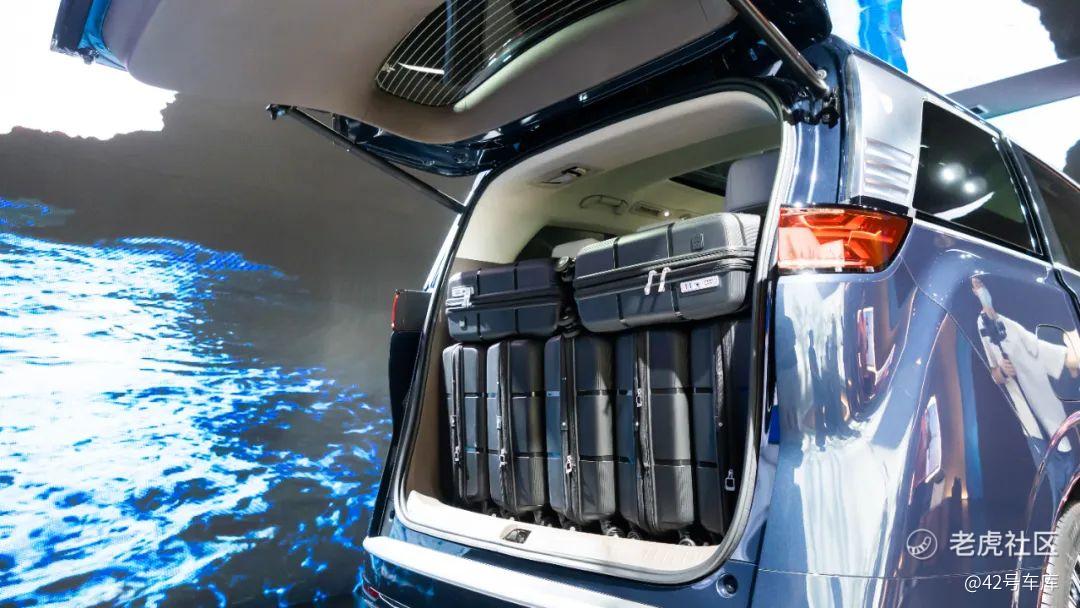 后备箱储物空间一向是 MPV 的弱项,但腾势这次给我们演示了宣传的「7+7」空间,也就是车内同时乘坐 7 个 180 cm 左右的男性,同时在后备箱放置 7 个登机箱,这个空间在 MPV 中算是相当不错了。并且,即使是放满了7个行李箱,后备箱仍有一些空间可以放置一些小件行李。如果第三排座椅不需要坐人,还可以放倒获得更大的储物空间。