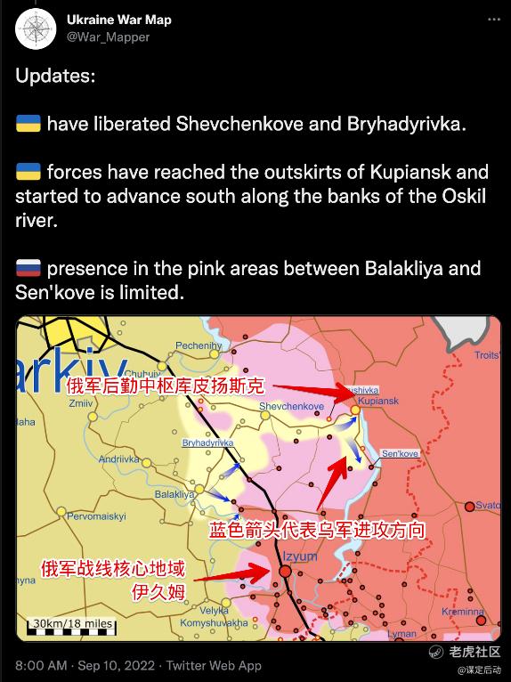 在南部战线上,乌军发起了对赫尔松方向的进攻,进攻初期受挫,但是还是突破了俄军的第一道防线;然而南部战线原来只是佯攻,乌军的真正主攻方向却是在东部战线上,好一个声东击西,乌军东部战线上三天就推进了50公里,9月9日的消息称已经逼近俄军后勤枢纽库皮扬斯克,从而切断伊久姆俄军主力东部集群的退路,导致整个俄军战线有崩溃的危险。