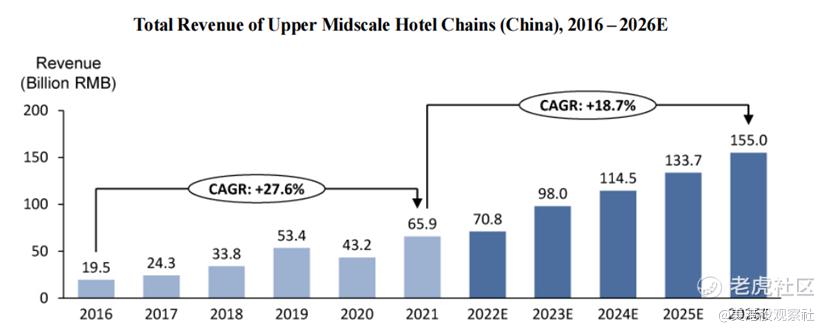 尤其是随着消费者对于品质生活的需求不断增长,中高端连锁酒店的规模也将会不断增长,根据弗若斯特沙利文的数据,2021年国内中高端连锁酒店的总收入规模达到659亿元,2016年-2021年CAGR达到27.6%,预计到2026年将达到1550亿元,2021年-2026年CAGR将达到18.7%,保持高速增长。