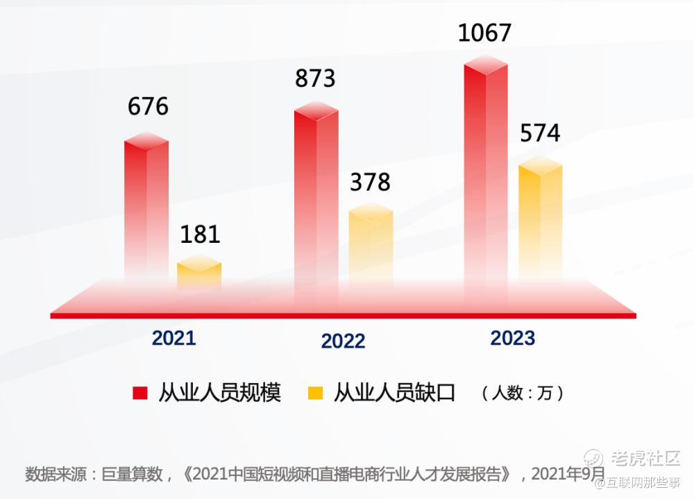 《2021中国短视频和直播电商行业人才发展报告》显示,2021年至2023年短视频和直播电商领域的从业人才缺口分别为181万人、378万人、574万人,需求逐渐增长。其中,对网络主播的需求量占比超过45%。