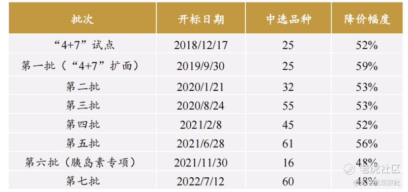 2021年9月,医保局在“4+7”的基础上将药品集采扩大到了全国25个省市,这算是全国层面的第一批药品集中采购。经过2020年1月和8月、2021年2月、6月和11月,以及2022年7月历次集采,医保局共进行了7批集采,一共覆盖了294中药品,如果按照集采前的价格测算,总的集采规模已经占到了公立医院化学药、生物药年采购额的35%。集采药品也进行了大幅降价,平均降幅达到53%,造福了一大批患者。