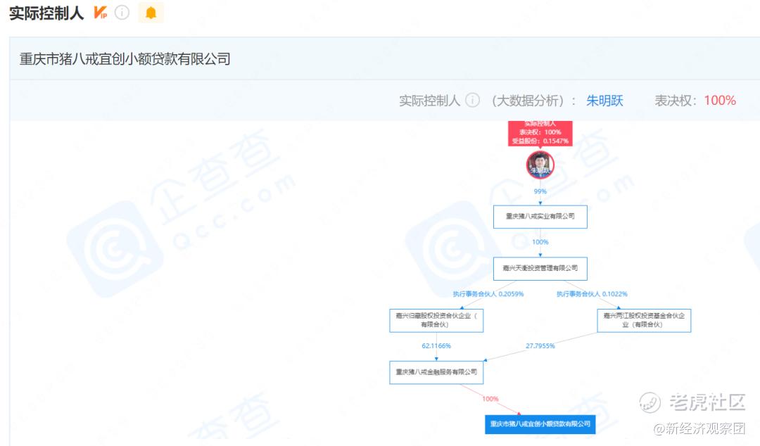 截止目前,上述金融公司已全部归于重庆猪八戒金融服务有限公司(以下简称“猪八戒金融”)旗下。而猪八戒金融的法人、高管以及股权上仍与猪八戒网关联颇多,其他三家金融公司也仍在正常运营中。例如,猪八戒金融法人和执行董事董长城为猪八戒网的董事,股权穿透后也能看到实控人仍为猪八戒网创始人朱明跃。