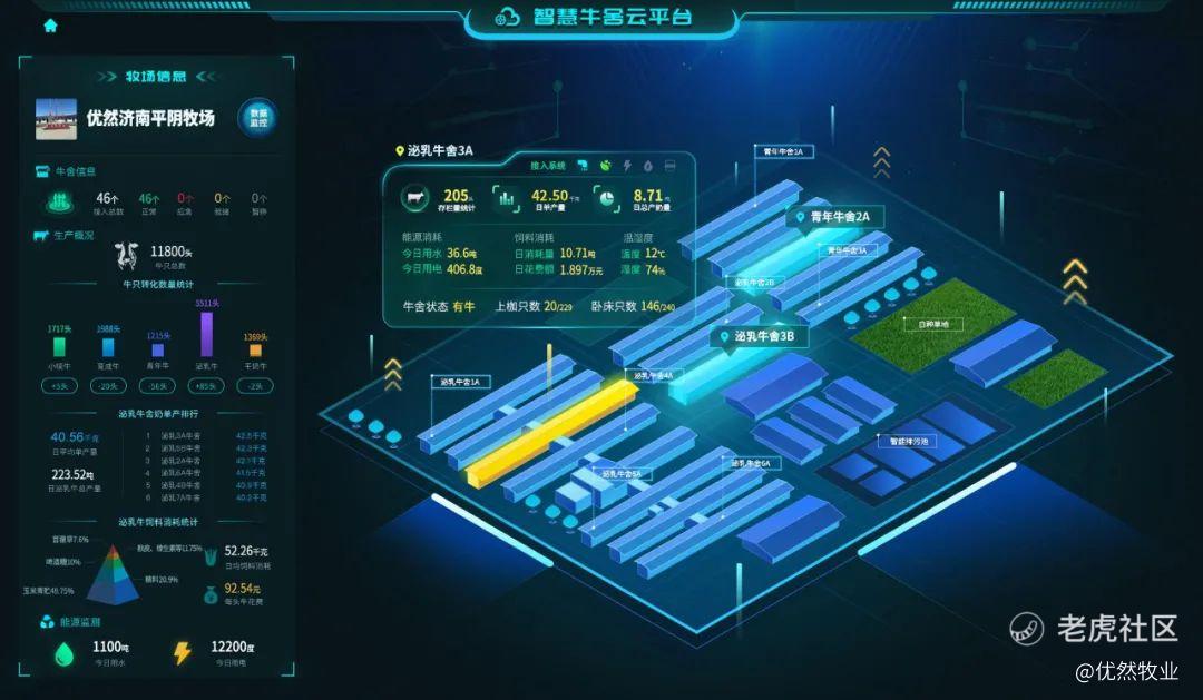优然牧业自主研发的智慧牧场管理系统,对牧场生产各环节进行大数据监控和分析,对奶牛的全生命周期进行管理。在行业内率先将物联网云技术应用于牧场的环境变量实时监测与调控系统,根据奶牛的生理特征,对牛舍温度、湿度、气体、光照等环境变量进行实时监测,智能调控,实现奶牛牛舍环境变量可根据季节、天气的变化进行自动化控制和远程监控,使牛舍环境管理更加科学规范和有效。保障奶牛生活舒适健康,提升奶牛福利的同时,更能大大降低人工成本,提升人工效率20%以上,进而提高运营效益。
